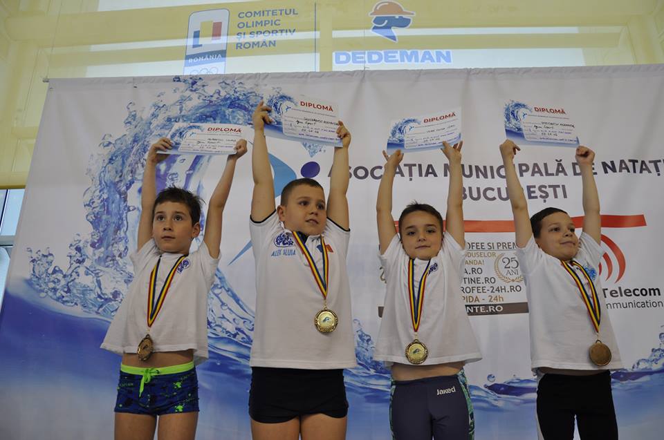 Stafeta baietilor de 7 ani in proba de 4*50 liber: Ghelbereu Leonard, Stoicescu Alexandru, Popescu Vlad, Ivascu Tudor